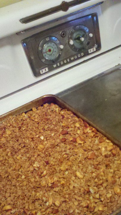 Spread the mixture evenly on two cookie sheets with edges (if the sheets don’t have edges the granola will slide off when you turn it and you must turn it).